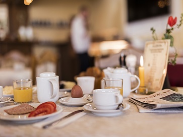 Auch nachmittags wird eine frische Tasse Kaffee oder Tee und Kuchen genauso schmecken wie abends die gepflegten Weine, Biere und Drinks.